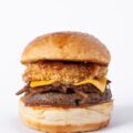 Burger köftesi (130 g), cheddar peyniri, barbekü sos, füme et ve 2 adet soğan halkası